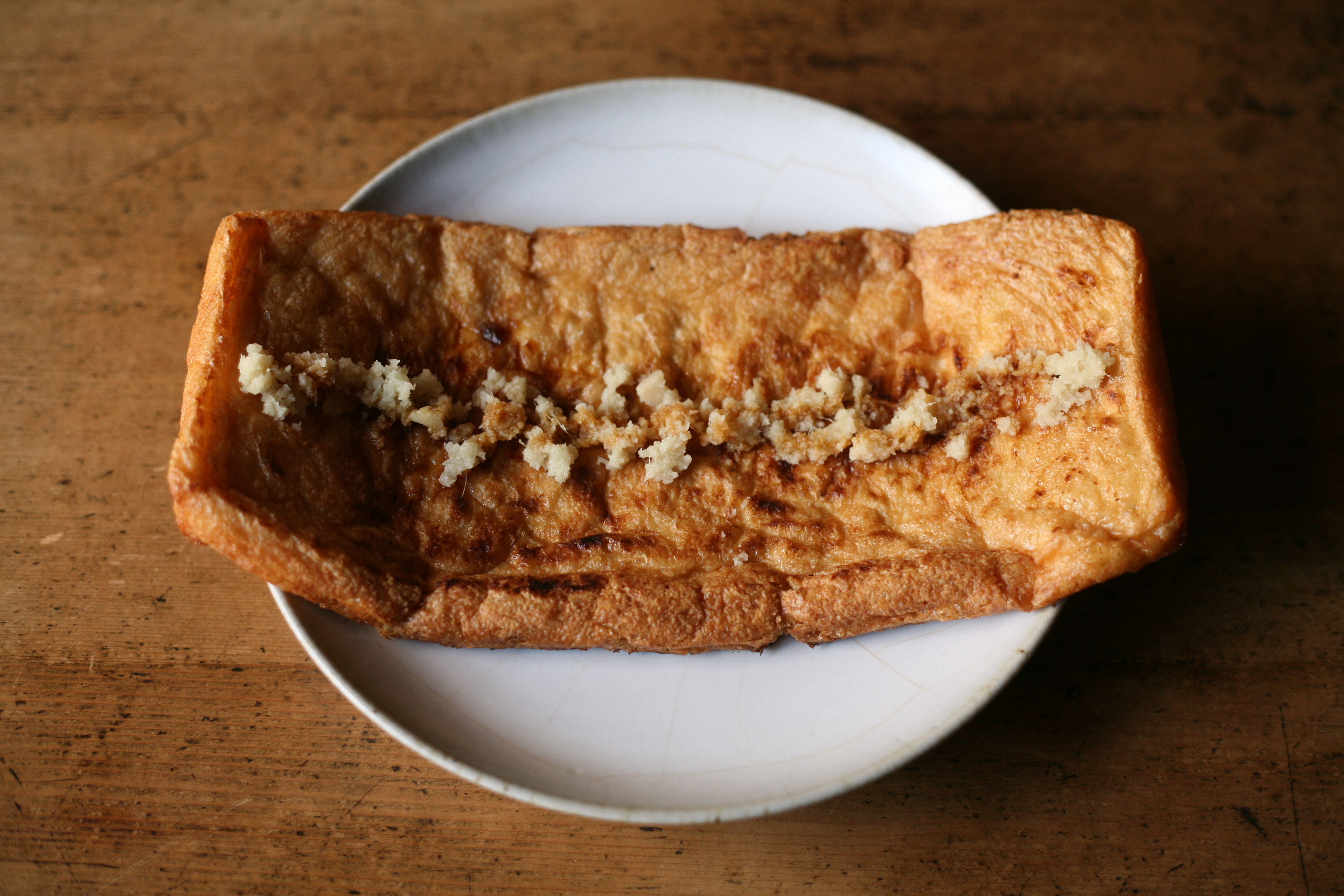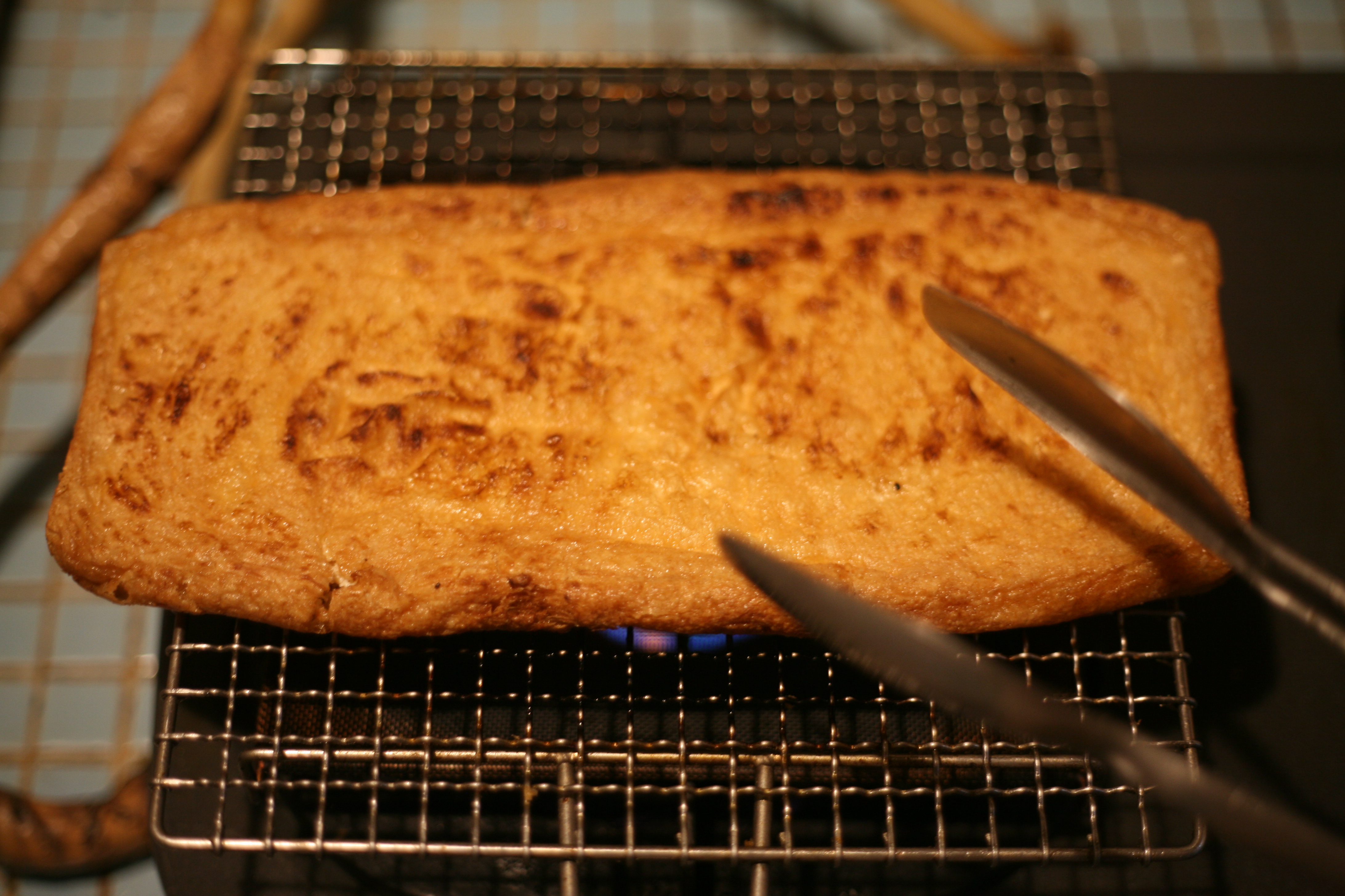 Ich habe schon immer gerne gegrillten Atsu-age (dicker gebratener Tofu) mit getrockneten Bonitoflocken, grünen Zwiebeln und Sojasoße gegessen, aber neulich fand ich auf der Rückseite einer Packung mit großen Abura-age-Stücken, die ich gekauft hatte, ein Rezept, in dem es hieß, man solle sie in einer Pfanne ohne Öl grillen, bis sie braun werden, und sie dann mit Shichimi-Chili und Ingwer-Sojasoße essen. Der Name „ganze gegrillte Abura-age“ hat einen starken Eindruck auf mich gemacht. Ich sehe, dass es eine Weile dauert, bis die üblichen Atsu-age innen heiß werden, aber Abura-age ist vielleicht eine Abkürzung! Ich habe sofort geriebenen Ingwer vorbereitet, abura-age auf ein großes Grillnetz mit Griffen gelegt und bei schwacher bis mittlerer Hitze erhitzt. Wenn das Abura-age gerade braun wird, wenden Sie es mit einer Zange. Die knusprige Textur, die Sie an der Spitze der Zange spüren, steigert Ihre Vorfreude. Wenn auch die Rückseite gar ist, wird sie auf einen Teller gelegt und mit geriebenem Ingwer und Sojasauce angerichtet.
