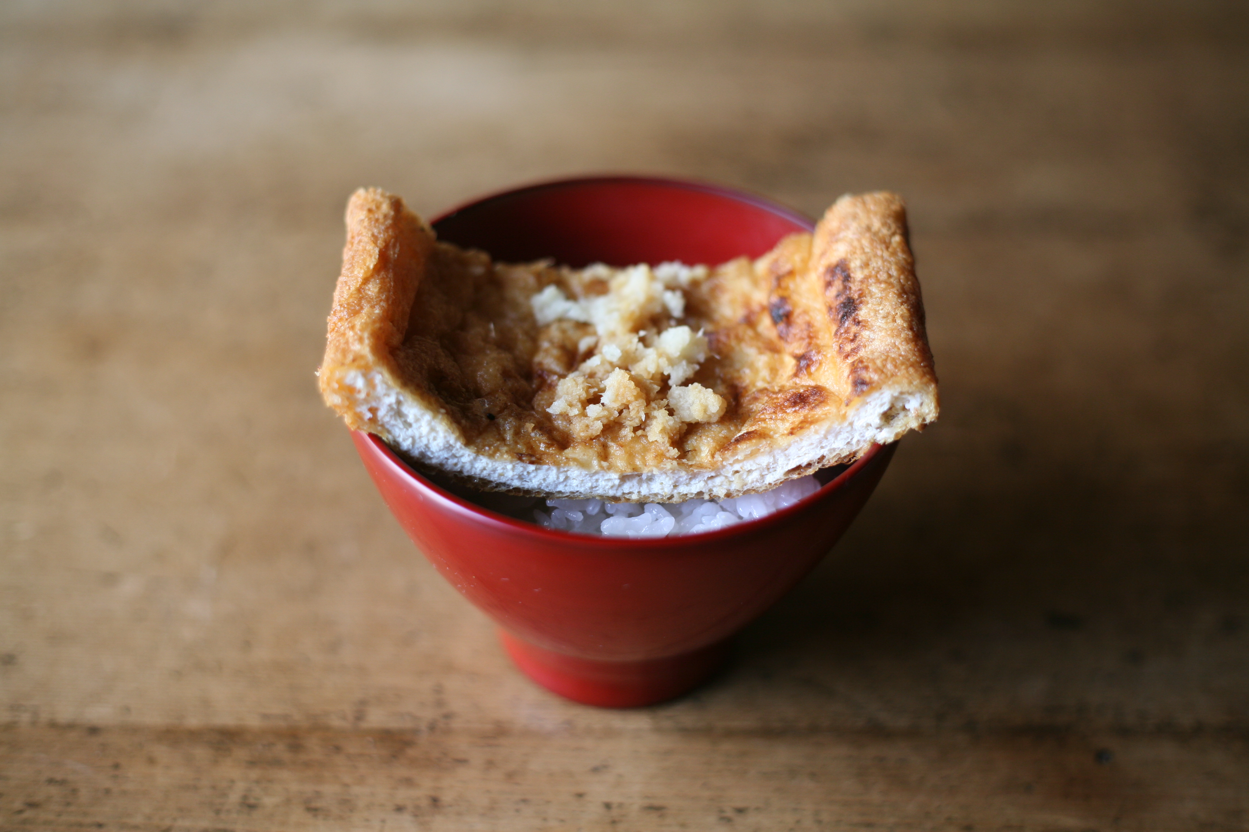 Schneiden Sie die Abura-age in große Stücke und servieren Sie sie über weißem Reis. Nehmen Sie den ersten Bissen Abura-age. Das duftende Aroma ist außen knusprig und innen weich und saftig, und der geriebene Ingwer und die Sojasauce passen perfekt dazu. Geben Sie dann noch etwas Sojasauce dazu und servieren Sie Abura-age und Reis zusammen. Das ist ein Festmahl für sich. Außer Reis brauchen Sie nur noch Ingwer und Sojasauce zuzubereiten. Das Schöne an diesem Gericht ist, dass es so einfach zuzubereiten ist, dass man nicht einmal das Öl entfernen muss, um es knusprig zu machen.