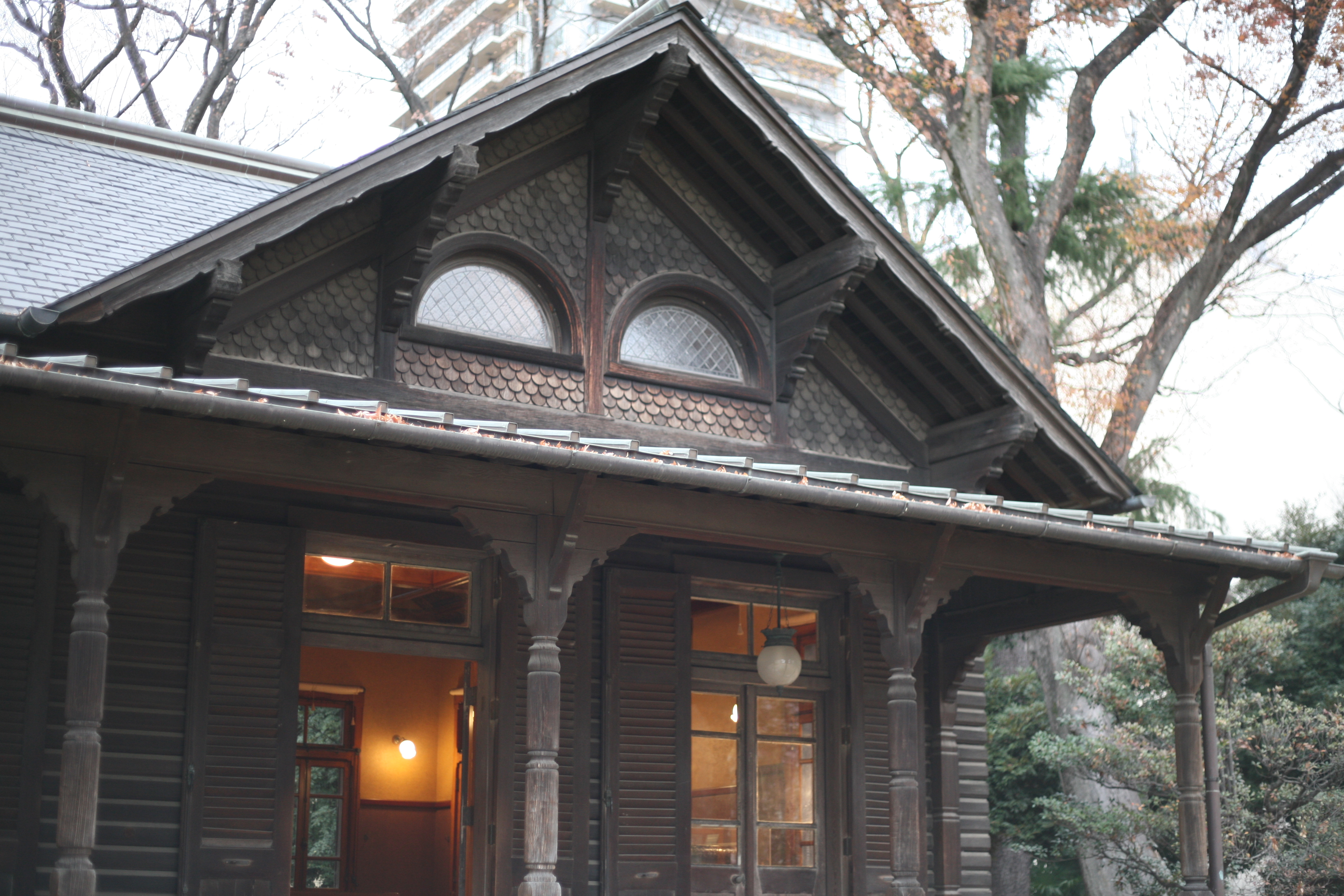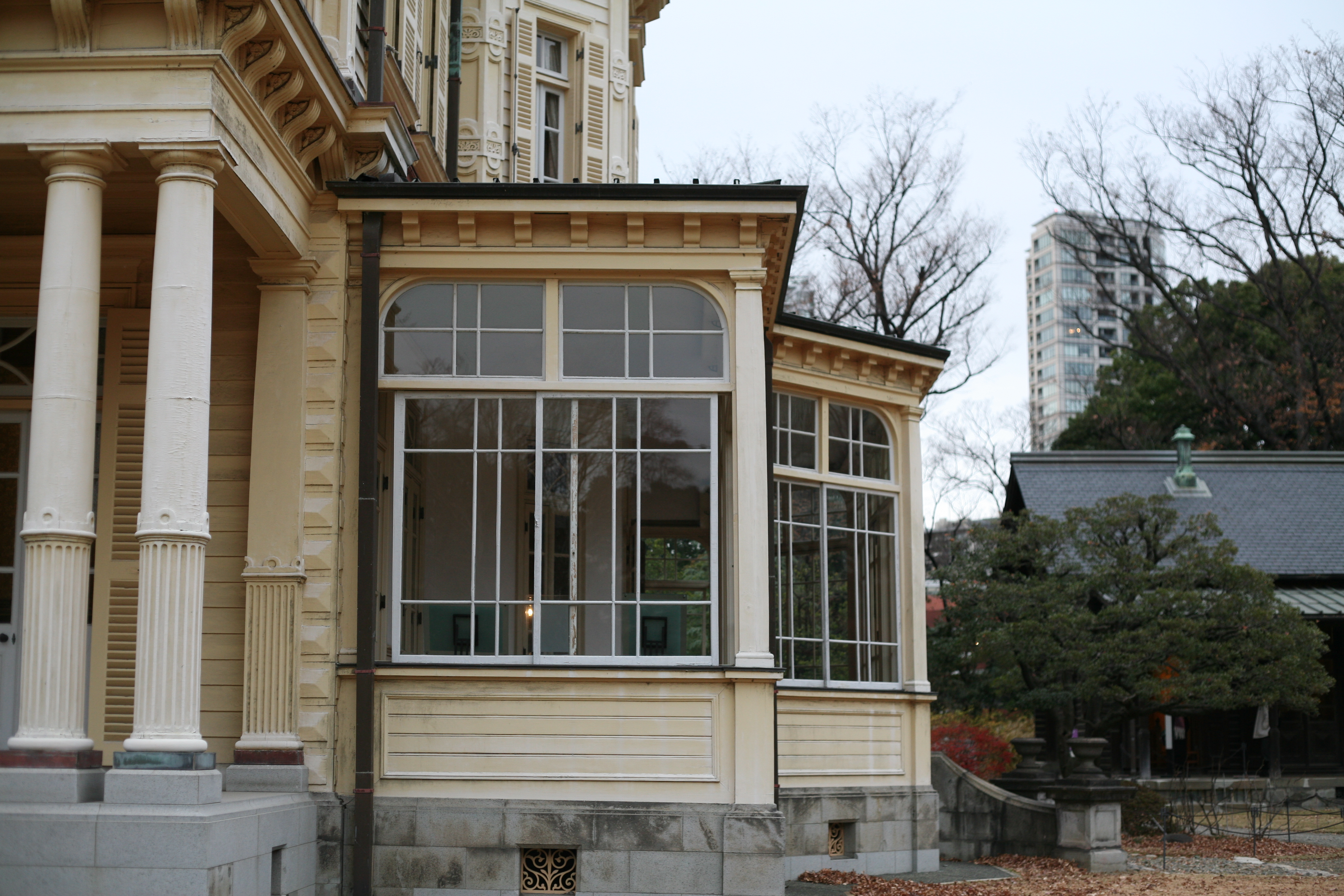 Das westliche Gebäude, das Herzstück dieser Residenzen, wurde von Josiah Conder entworfen, dem britischen Architekten, der für seine Arbeiten am Rokumeikan und Mitsubishi Ichigokan bekannt ist. Es wurde als zweistöckiges Holzgebäude mit Keller entworfen und vereint gekonnt die stilistische Schönheit der westlichen Architektur mit den klimatischen und natürlichen Gegebenheiten Japans. Die Dekorationen im jakobinischen Stil im Inneren der Villa waren sowohl imposant als auch filigran. Die Details – Böden, Wände, Decken – zeugten von einer ausgeprägten ästhetischen Sensibilität für das Wohnen.