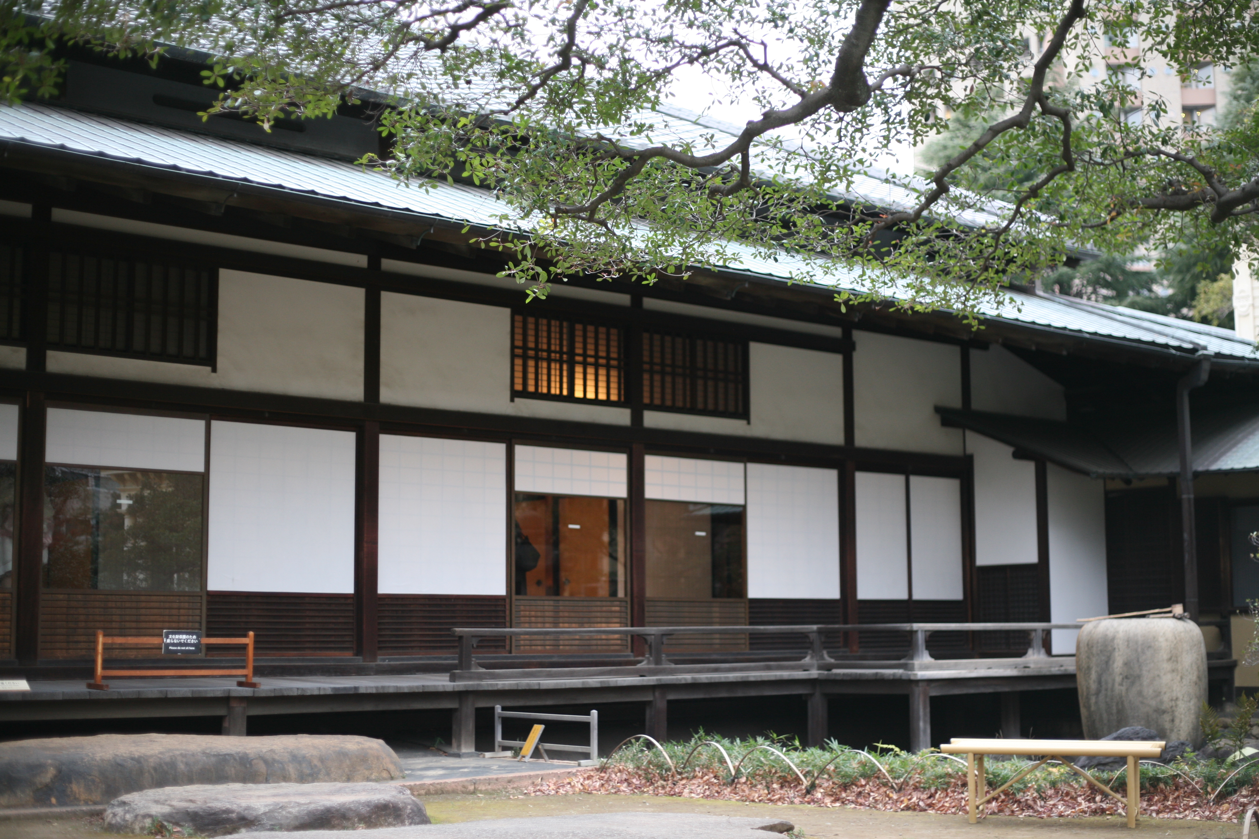 Das an das westliche Gebäude angrenzende Gebäude im japanischen Stil ist hingegen eine rein traditionelle japanische Architektur im Shoin-zukuri-Stil. Es bewahrt Wandgemälde für die Tokonoma-Nische und Fusuma-Schiebetüren, die angeblich vom japanischen Maler Hashimoto Gaho aus der Meiji-Zeit entworfen wurden. Das Gebäude im japanischen Stil diente als Wohnbereich, während das Gebäude im westlichen Stil in erster Linie als privater Empfangssaal für die jährlichen Familienfeiern der Familie Iwasaki und für Partys mit Ausländern und angesehenen Gästen genutzt wurde. Darüber hinaus wurde der Billardraum, der über einen unterirdischen Gang mit dem Gebäude im westlichen Stil verbunden ist, im Schweizer Chalet-Stil erbaut, der zu dieser Zeit in Japan selten war und die Faszination für ausländische Geschmäcker stark widerspiegelte.